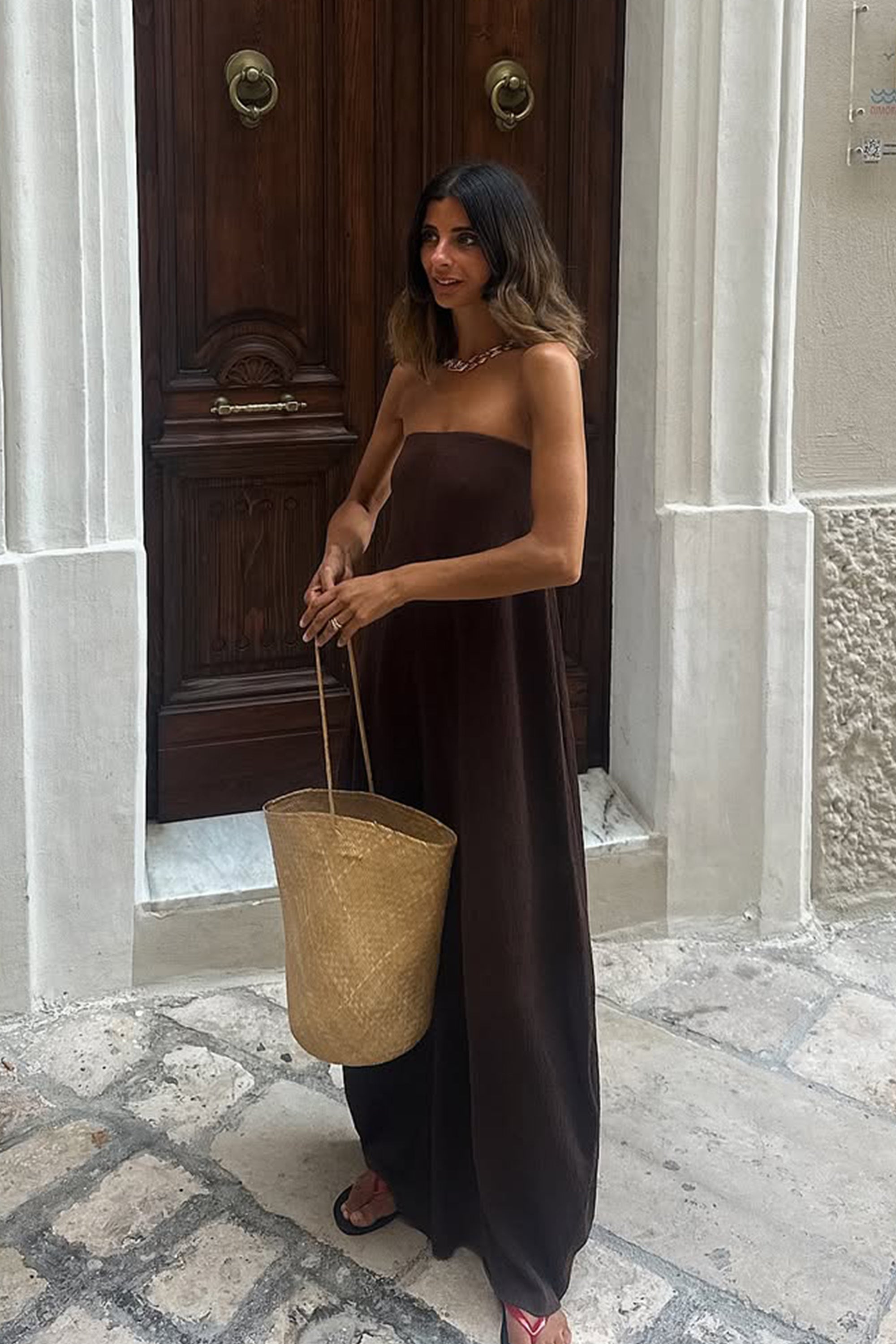 Stas wearing ALIAS CHOC TEXTURED KNIT STRAPLESS MIDI DRESS