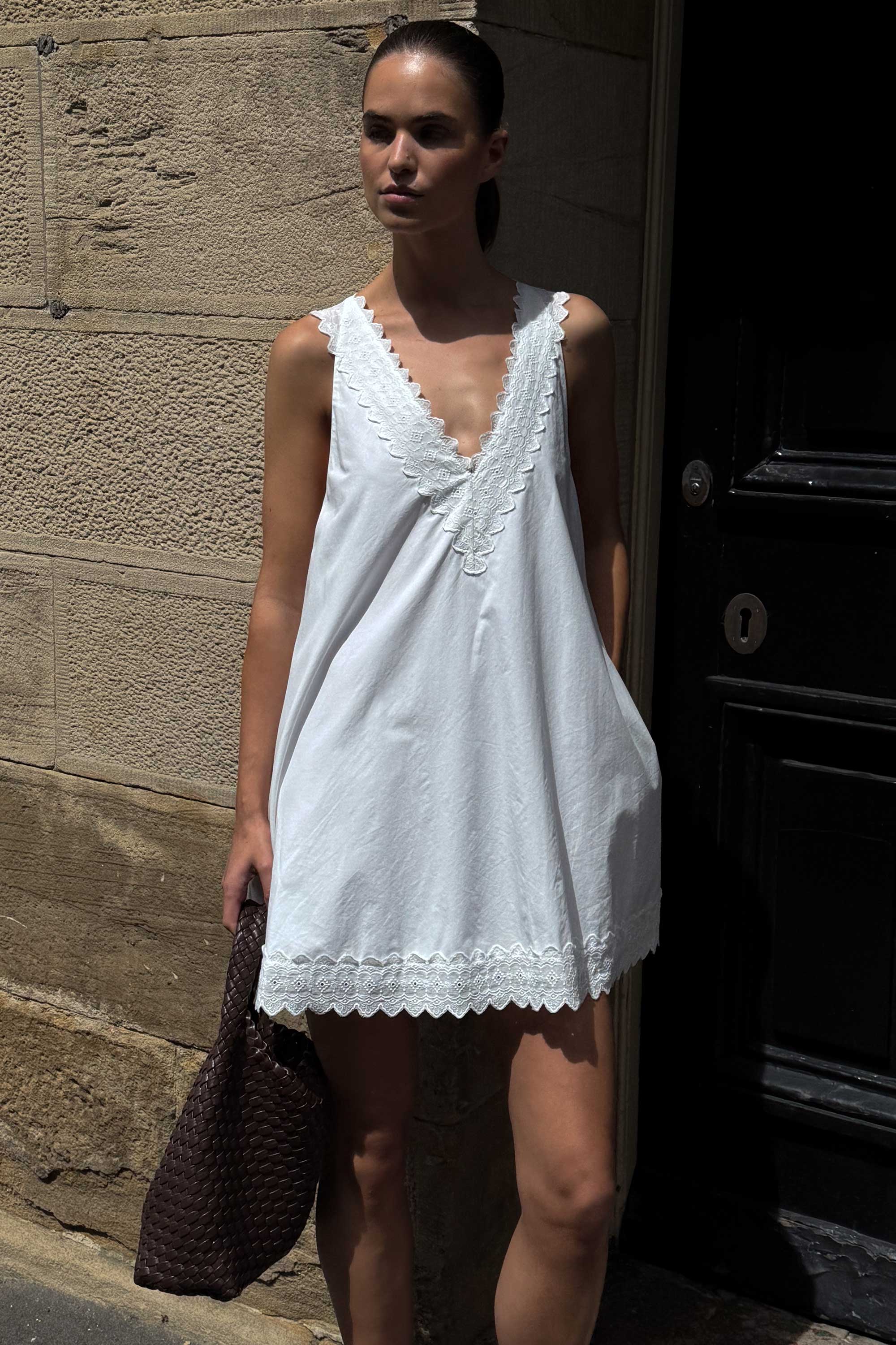 • Aude wearing ANNABEL WHITE SLEEVELESS V NECK MINI DRESS