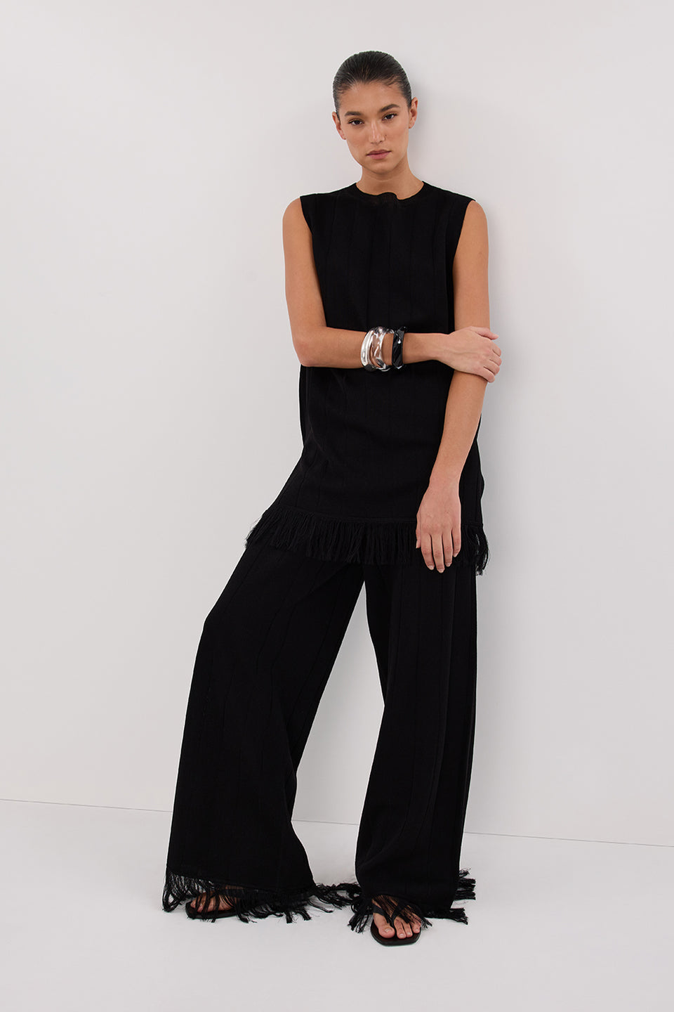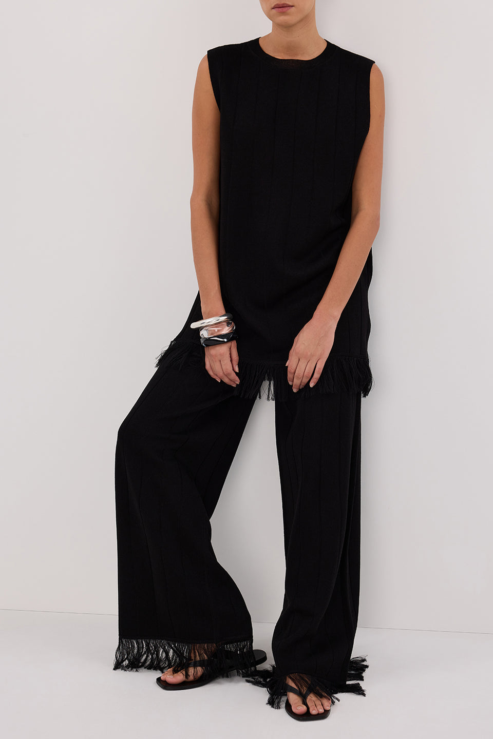 - Side splits through hemline featuring self fringing finishings