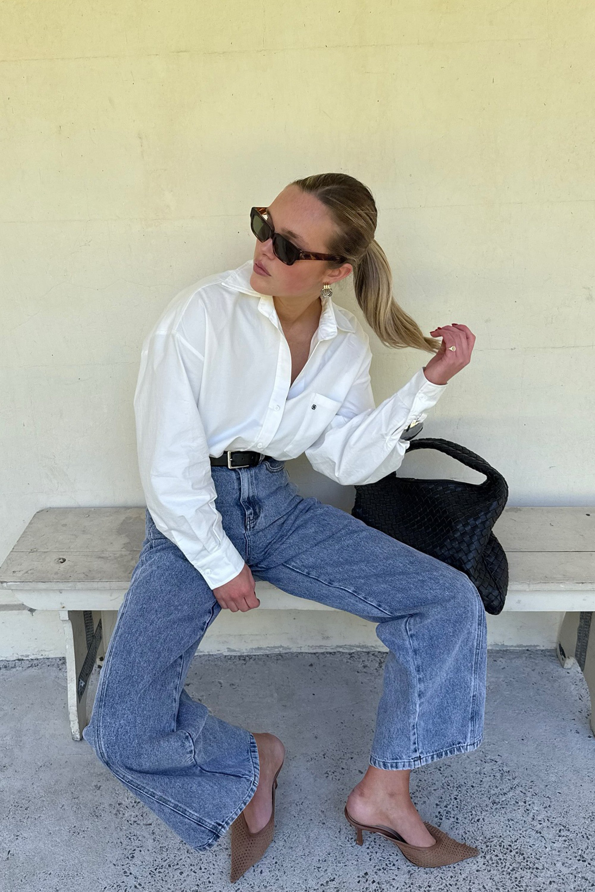 Casey wearing CARSON MID BLUE WIDE LEG JEAN