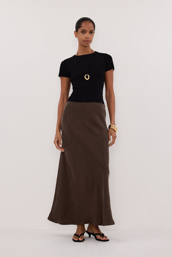 CONNIE BITTER CHOC CUPRO MAXI SKIRT
