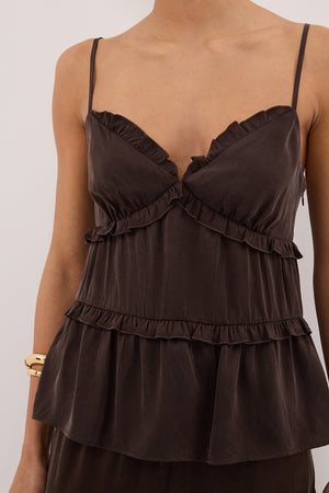 LENA BITTER CHOC SILK SLEEVELESS FRILL TOP