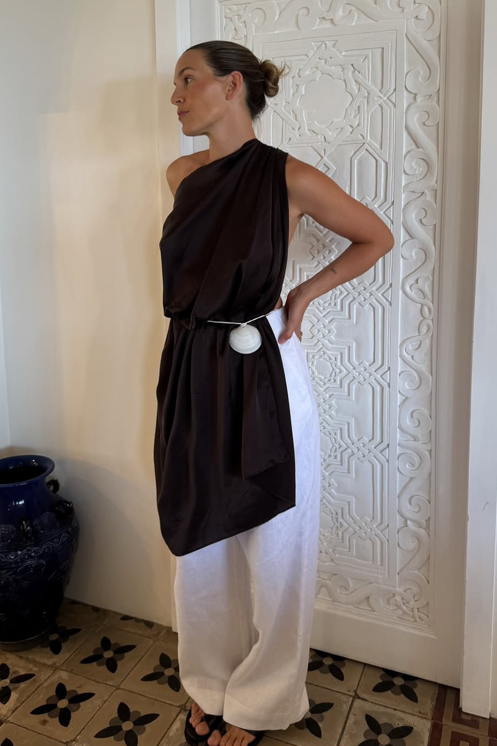 Kristen wearing PERCY BITTER CHOC SILK SCARF TOP