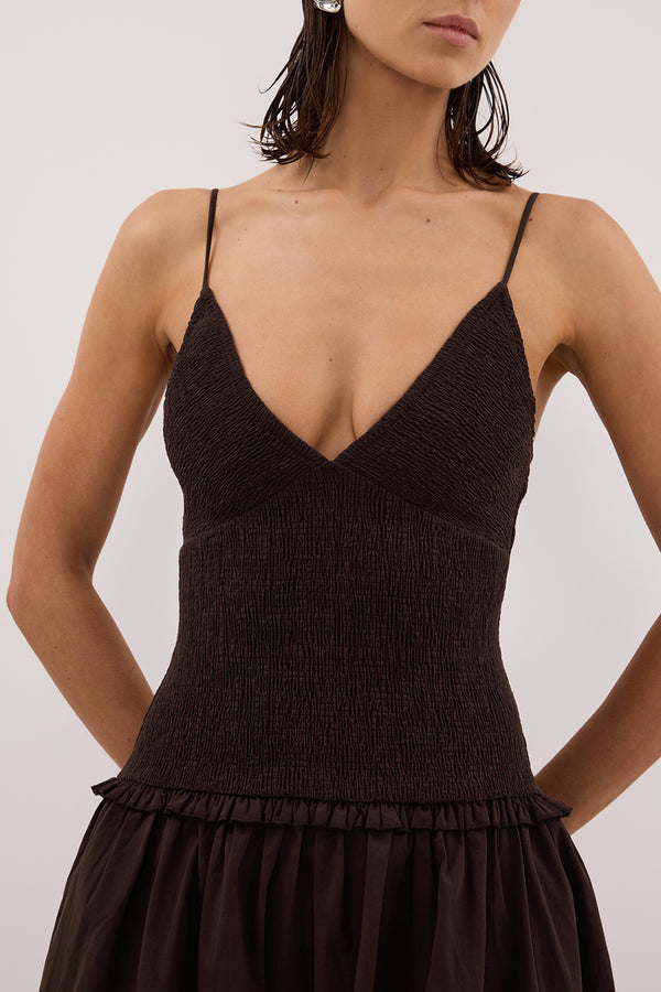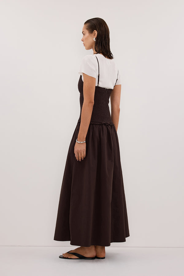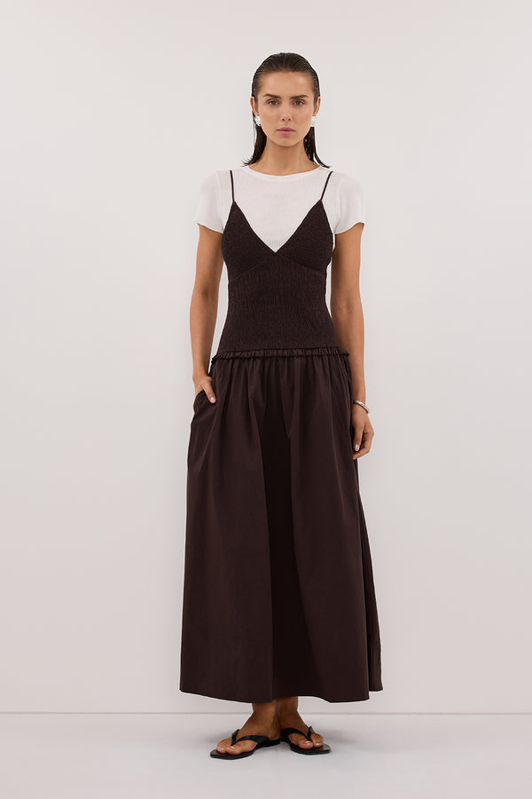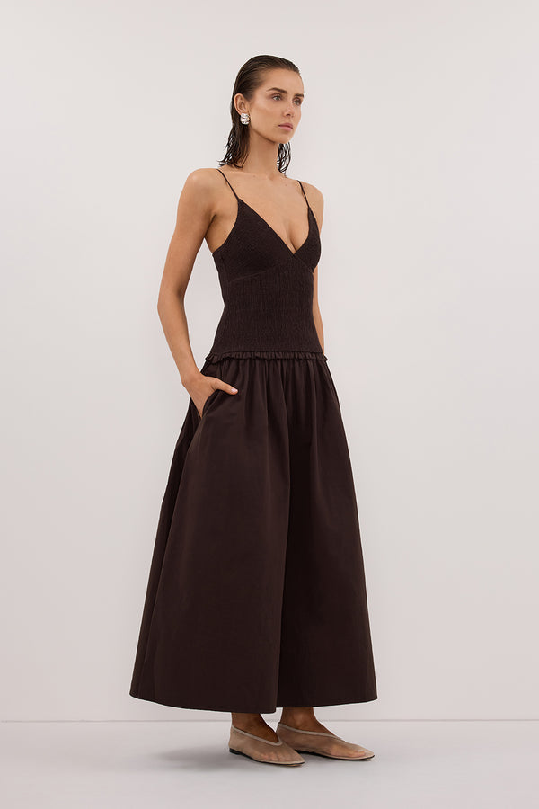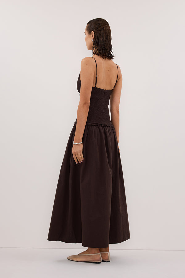 RAMONA BURNT CHOC SLEEVELESS COTTON MIDI DRESS