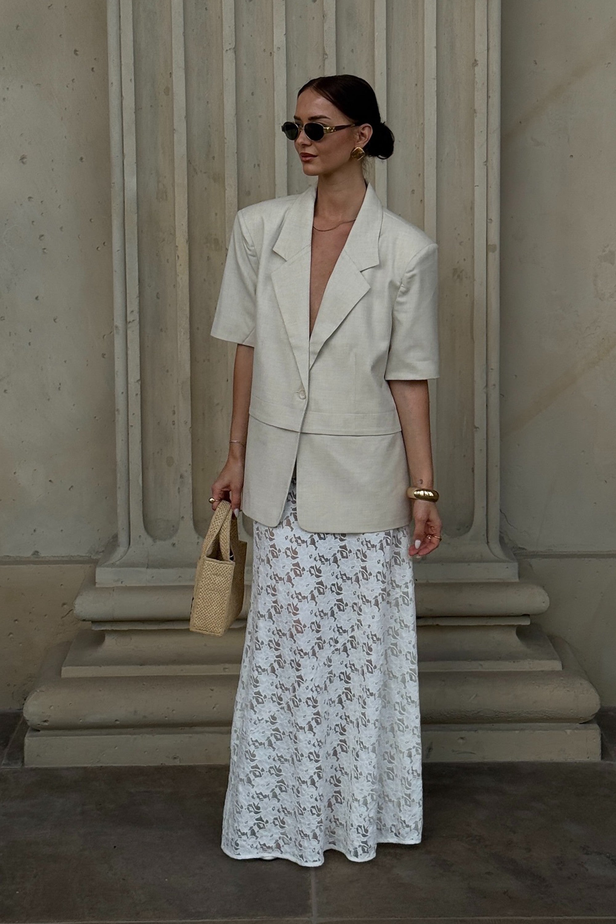 • Stas wearing RITA SAND SHORT SLEEVE BLAZER