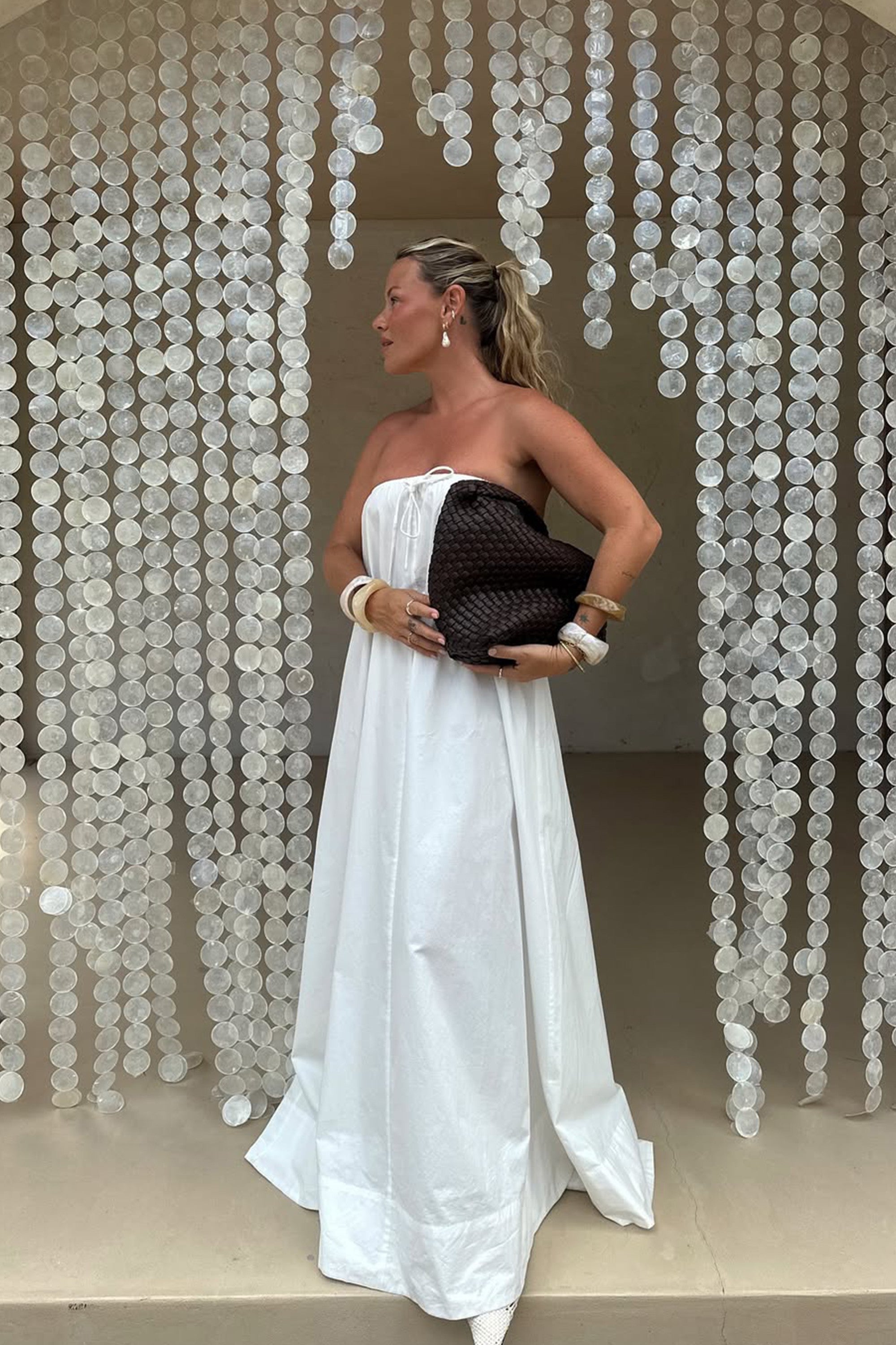 • Stas wearing SOMMER WHITE STRAPLESS POPLIN MIDI DRESS